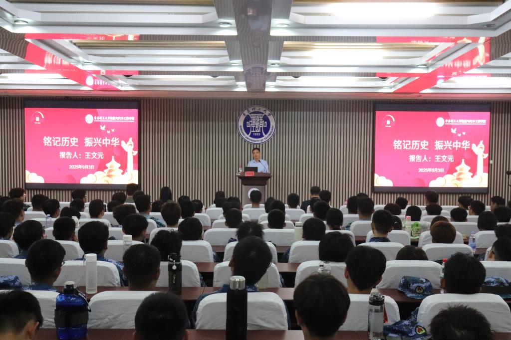 为纪念中国人民抗日战争暨世界反法西斯战争胜利80周年,引导广大青年员工铭记历史,开创未来,激励青年学子以奋进姿态投身民族复兴伟业,9月3日下午,太阳集团tyc9728在主教学楼东报告厅举办《铭记历史 振兴中华》专题讲座。原临沂市政协常委、科技局局长、二级巡视员、现临沂激光产业链“红领书记”王文元担任主讲嘉宾,公司党委书记李忠晓主持报告会。2025级300余名新生在开学伊始,共同聆听了这场别开生面的思政第一课。