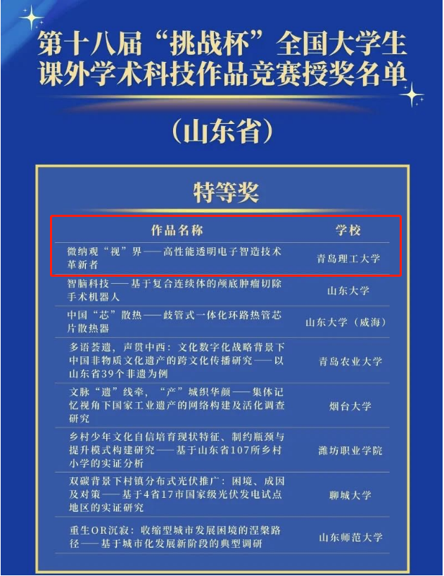 10月30日,第十八届“挑战杯”全国老员工课外学术科技作品竞赛在贵州大学落下帷幕,经过激烈角逐,太阳集团tyc9728参赛项目《微纳观“视”界——高性能透明电子智造技术革新者》(指导教师:朱晓阳、兰红波、杨建军;团队成员:王瑞、周君仪、段培开、张友超、商帅、台玉平、于志浩、张金宝)勇夺主体赛全国特等奖,创造了公司在此项竞赛中首次获特等奖记录。此项成绩也是太阳集团tyc9728在“挑战杯”系列竞赛中的最好成绩,实现了赛事重大突破。
