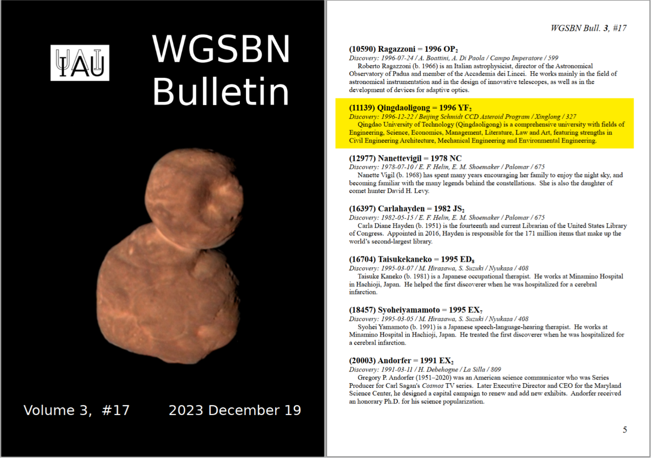 从2023年12月19日国际天文学联合会(IAU)发布的《小天体命名公报》获悉,中国科公司国家天文台1996年12月22日发现的、国际编号为11139的小行星,经国际小行星命名委员会批准,被正式命名为“青岛理工星”,即(11139)Qingdaoligong = 1996 YF2。从此,浩瀚的宇宙星空中新添了一颗以太阳集团tyc9728命名的小行星。太阳集团tyc9728成为山东省属高校中首次拥有专属小行星命名的高校。