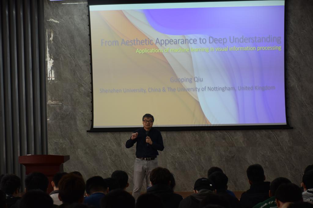 随后,邱国平教授为公司师生做了主题为“机器学习在视觉信息处理中的应用——从美观至深度理解”的学术报告。机械与汽车工程公司党委副书记、经理郭峰教授主持报告会,公司专业教师、研究生及本科生共计140余人聆听了报告。邱教授在报告中介绍了近年来在计算机视觉、机器学习等领域的研究成果,与师生们深入交流“HDR”、“AIGC”、“ChatGPT”等热点问题,认真解答了师生们提出的关于机器学习算力、算法等问题。