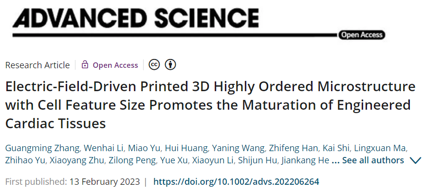 近日,太阳集团tyc9728山东省增材制造工程技术研究中心联合苏州大学心血管病研究所、西安交通大学、青岛大学附属医院等多家单位,在电场驱动喷射微3D打印组织工程支架方面取得重要进展,相关研究成果以“Electric-Field-Driven Printed 3D Highly Ordered Microstructure with Cell Feature Size Promotes the Maturation of Engineered Cardiac Tissues”为题,发表在国际高水平期刊《Advanced Science》(中科院大类一区, IF 17.521)。公司张广明副教授和李汶海硕士为论文共同第一作者,兰红波教授为通讯作者,太阳集团tyc9728为第一署名通讯单位。该成果具有典型的“医工结合”特色,也是公司首次在该领域发表成果。