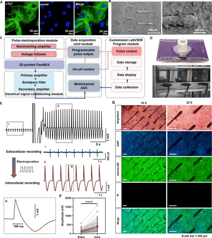 图2 基于3D打印FlexNEA器件的电生理传感-调控系统及心肌胞内动作电位记录