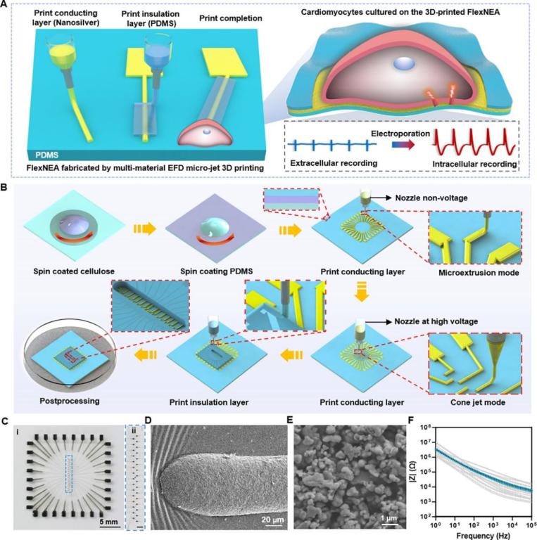 传统纳米电极阵列因制备工艺复杂、成本高昂,并在柔韧性和信号稳定性方面存在局限,难以满足心脏电生理学研究对高保真、高通量细胞内动作电位记录的需求。现有器件与细胞界面耦合效率低,且长期使用易引发细胞损伤,制约了其在药物筛选和疾病机制研究中的应用。针对这一挑战,研究团队创新性提出基于多材料电场驱动微喷射3D打印技术的柔性纳米银电极阵列(FlexNEA)器件,为心脏电生理记录提供了突破性解决方案。