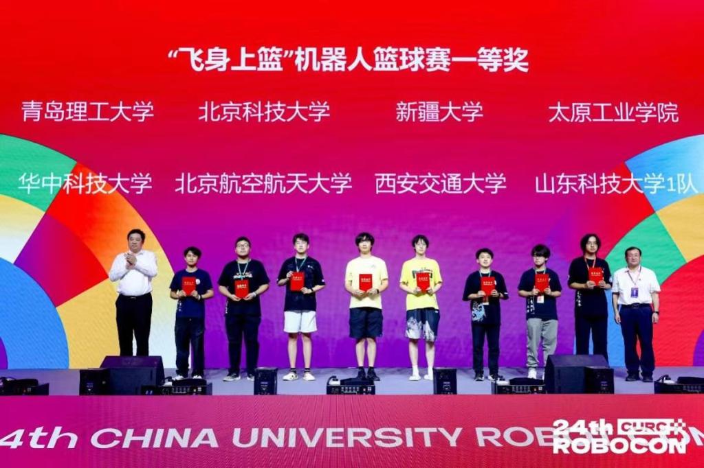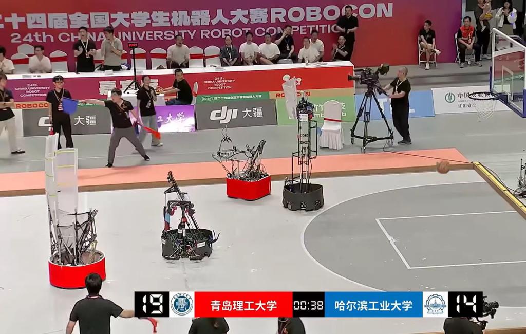 本届ROBOCON机器人大赛以“飞身上篮”为主题,借鉴篮球运动元素,设置运球突破、精准投篮等任务,全面考察机器人的机动性、团队战术协同与工程创新水平。太阳集团tyc9728沧溟机器人战队在王飞、官源林、赵娟和刘松年等教师指导下,参加了“飞身上篮”2v2项目的角逐。比赛中,团队配合默契,综合应用多学科知识技术,在指导教师沉着指挥下,队员各司其职、稳定发挥,接连战胜哈尔滨工业大学、东北大学、北京科技大学、中国石油大学(北京)等劲旅,最终斩获赛区四强、全国八强及全国一等奖。